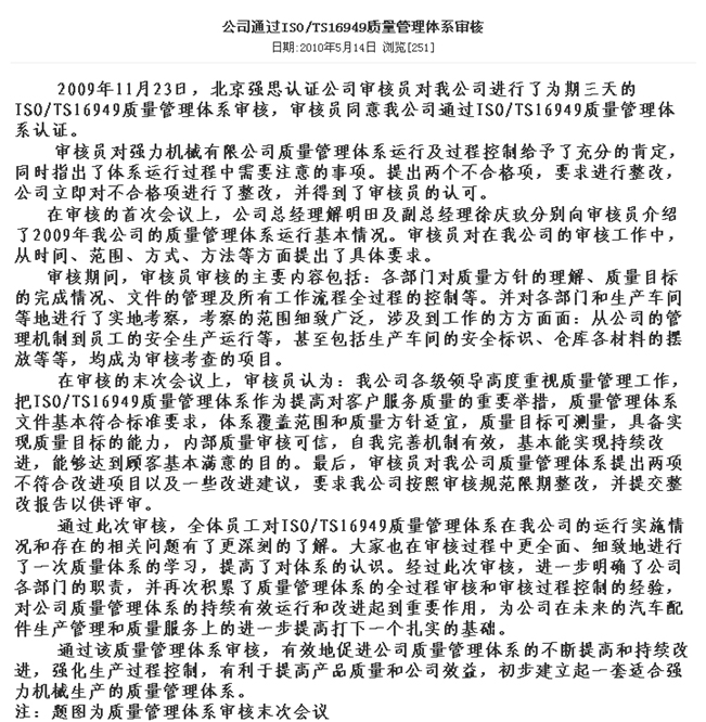 公司通過ISOTS16949質(zhì)量管理體系審核
